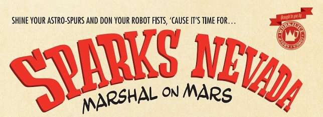Folksy Hal: Kids, shine your astro spurs and don your robot fists, 'cuz it's time for our (first) thrilling feature, Sparks Nevada, Marshal on Mars! Justice rides a rocket steed across the plans of the fourth planet, where one man brings fear to robots and aliens and hope to humans who make this frontier planet their home. He is Sparks Nevada, Marshal on Mars!